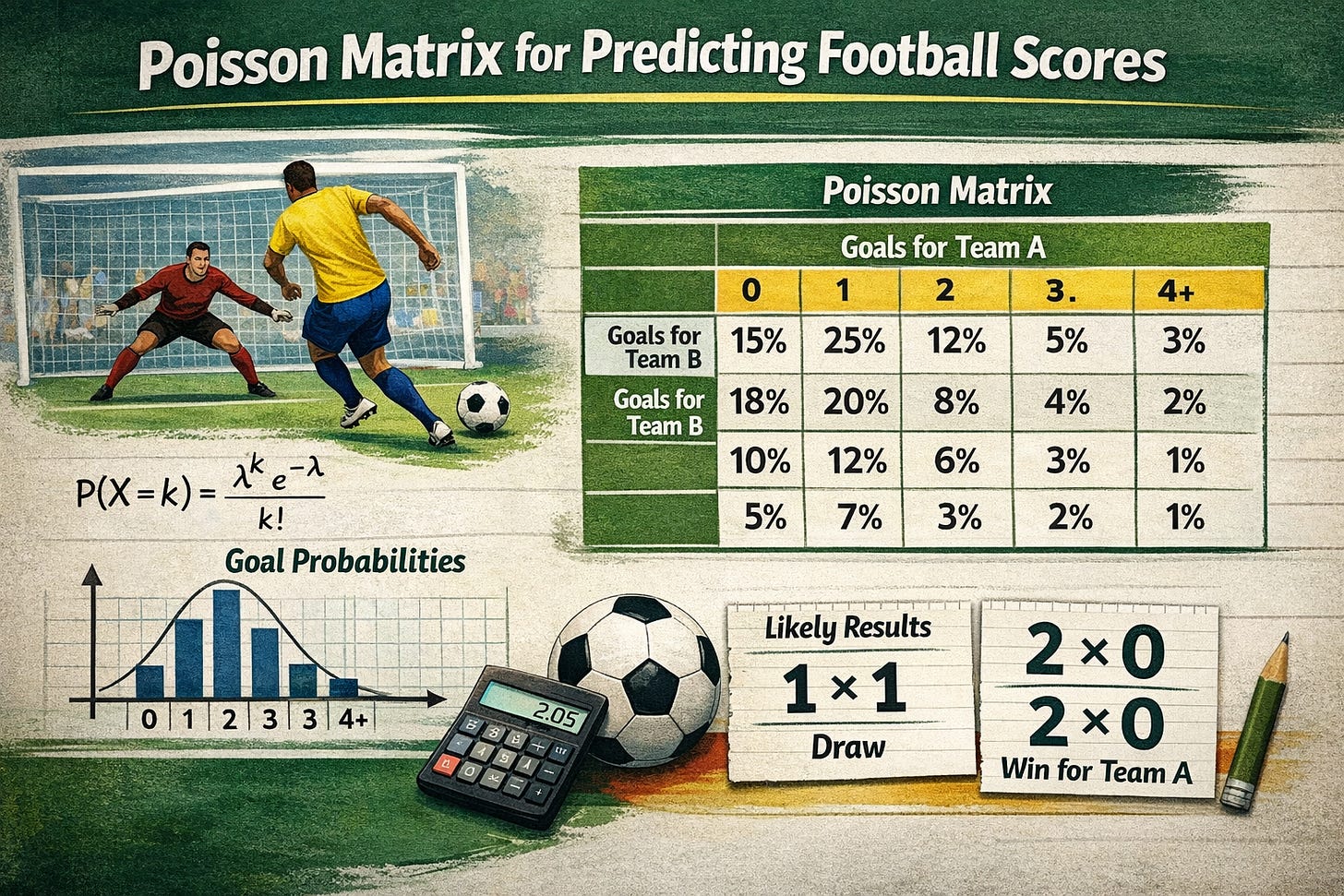 If you’ve ever wanted a clean, explainable baseline for football predictions—something you can implement in a few functions, test quickly, and ship into a web app—then the Poisson model is still one of the best places to start.