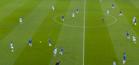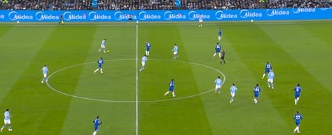 For most of the game, City built with three players in the first line, while Chelsea initially pressed with two. This numerical advantage allowed City to circulate calmly, draw pressure, and progress into advanced zones with minimal risk.