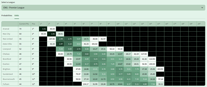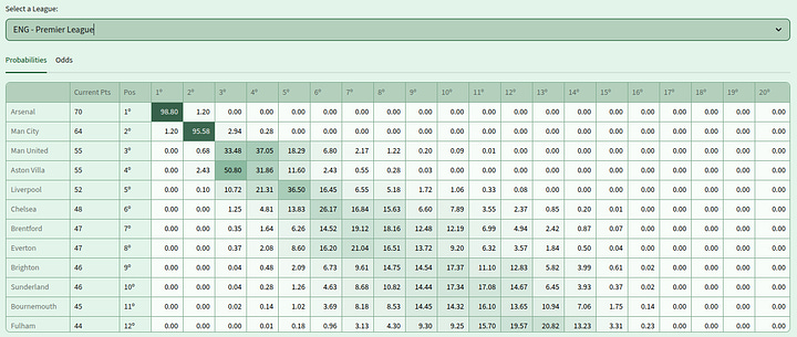 Manchester United currently sit 3rd in the table with 55 points, but their position becomes much more interesting when we look at probabilistic outcomes rather than just the standings.