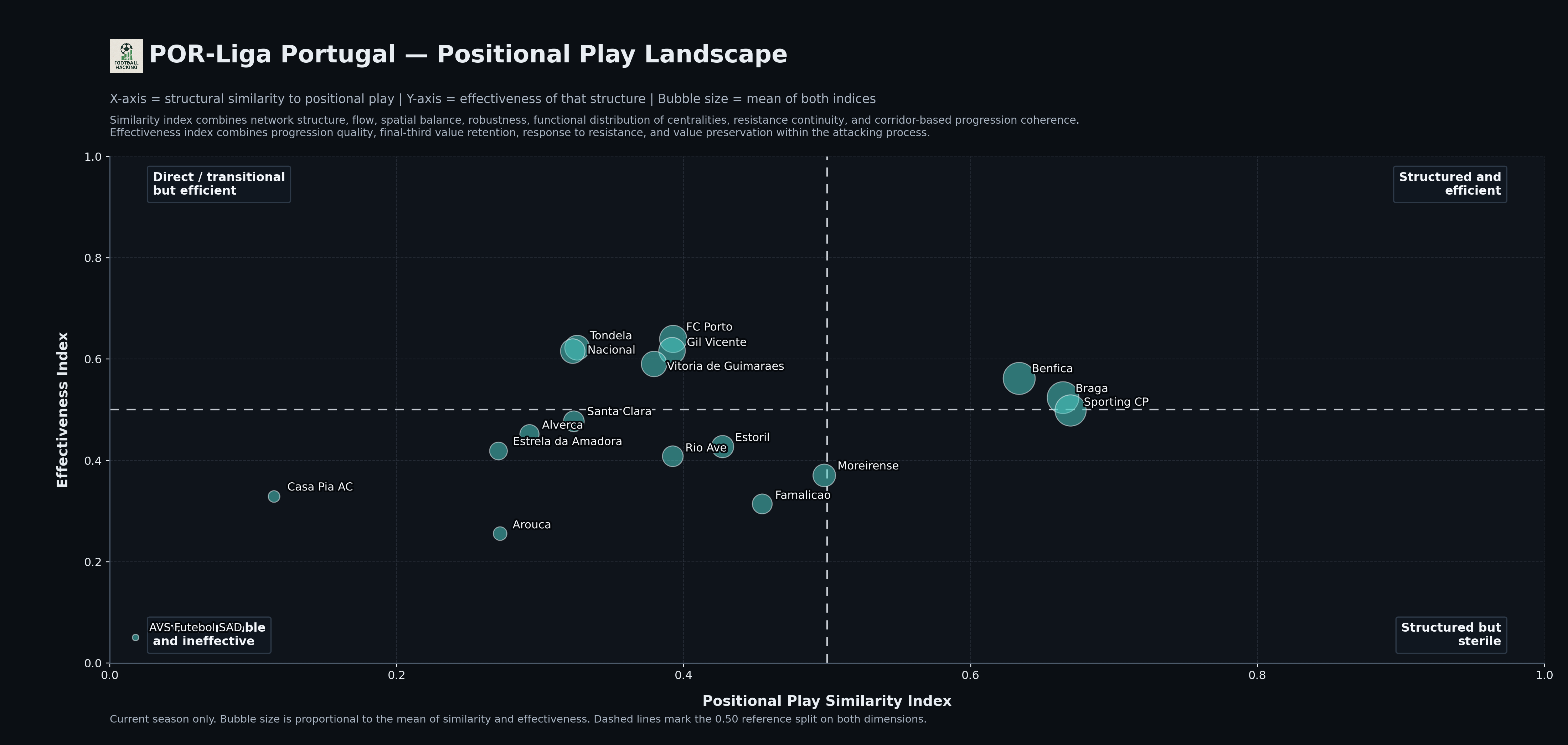 Liga Portugal reflects structural hybridity, where teams balance positional organization with transitional intent.
