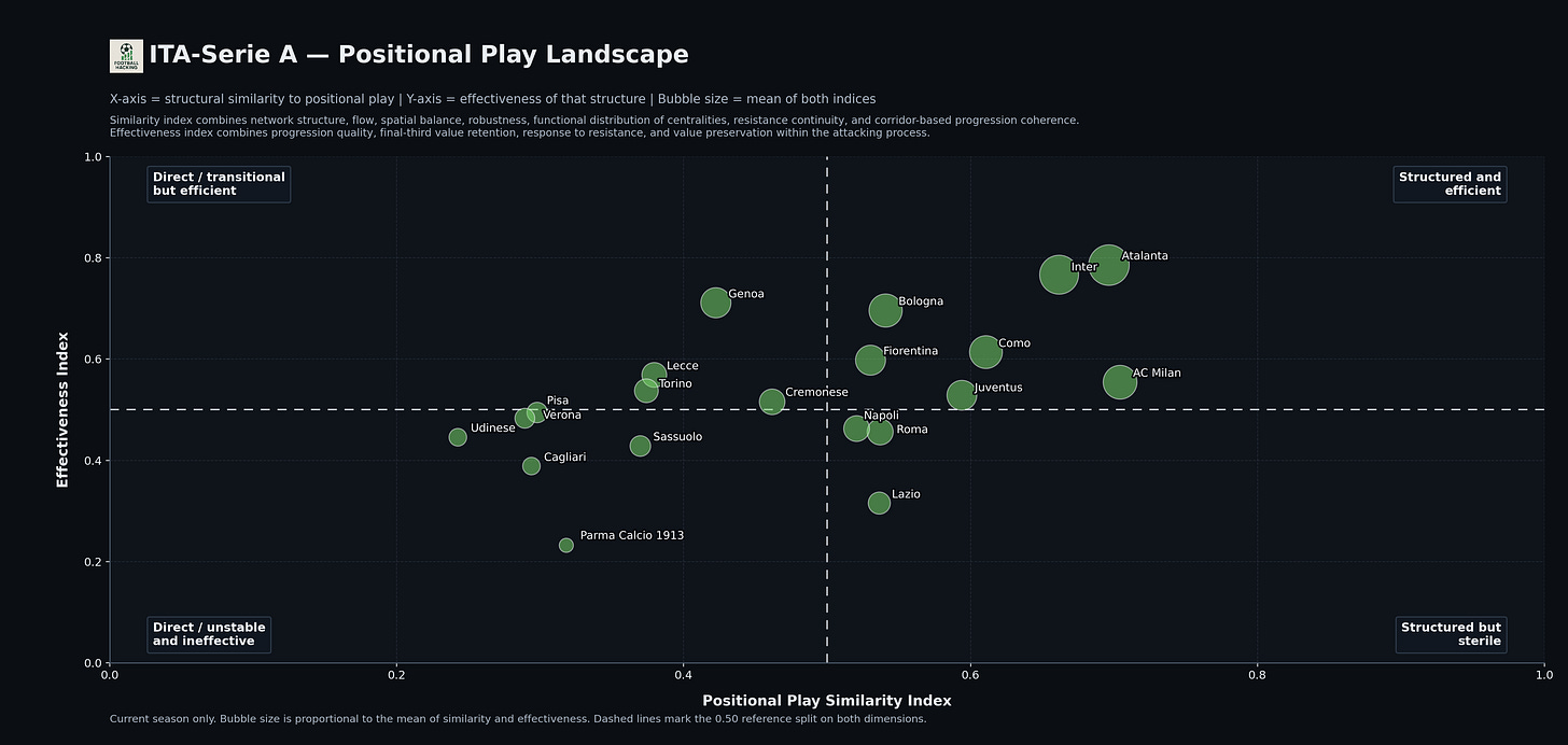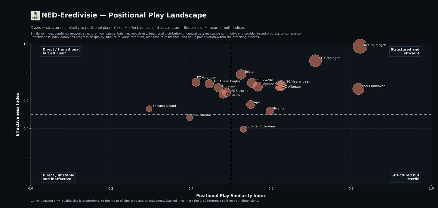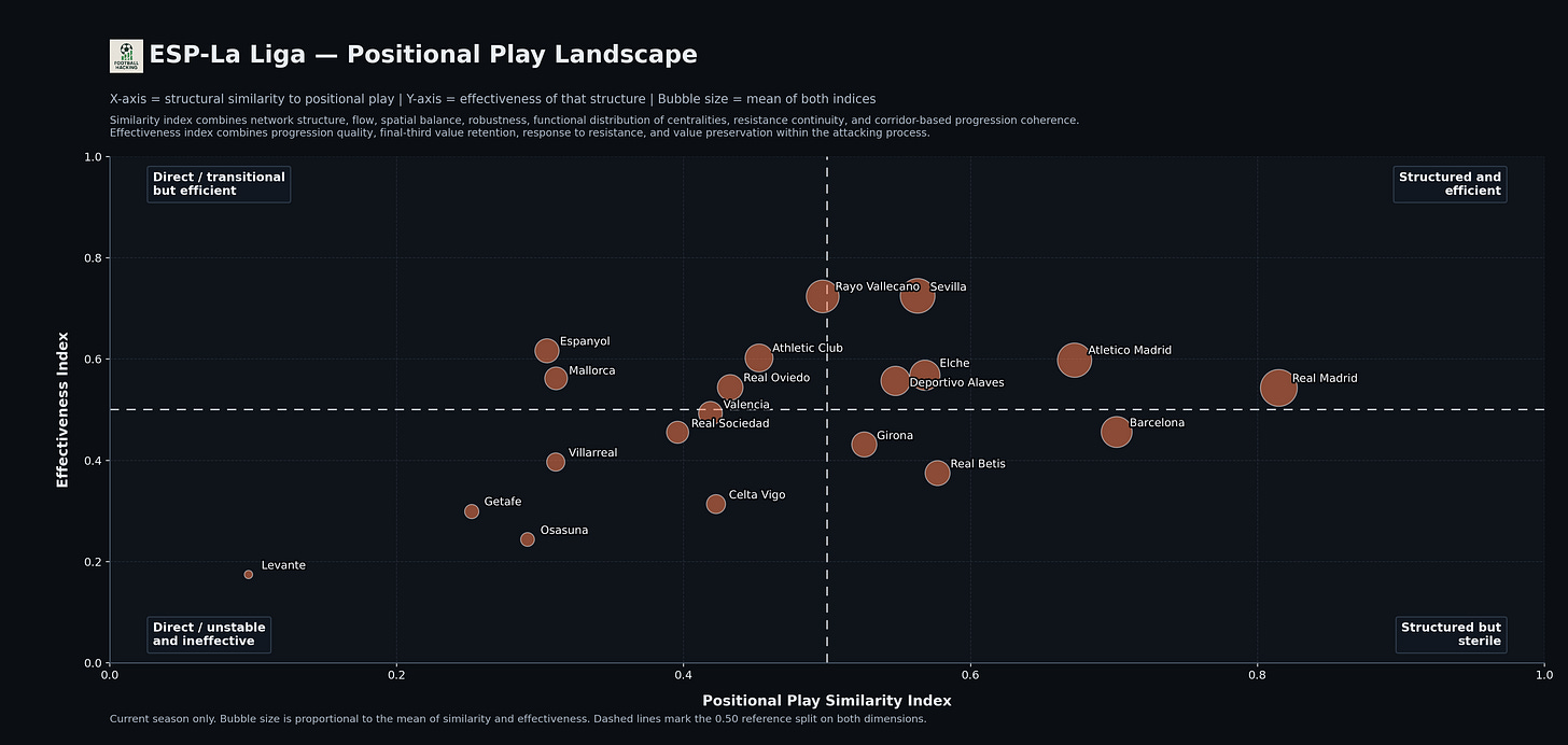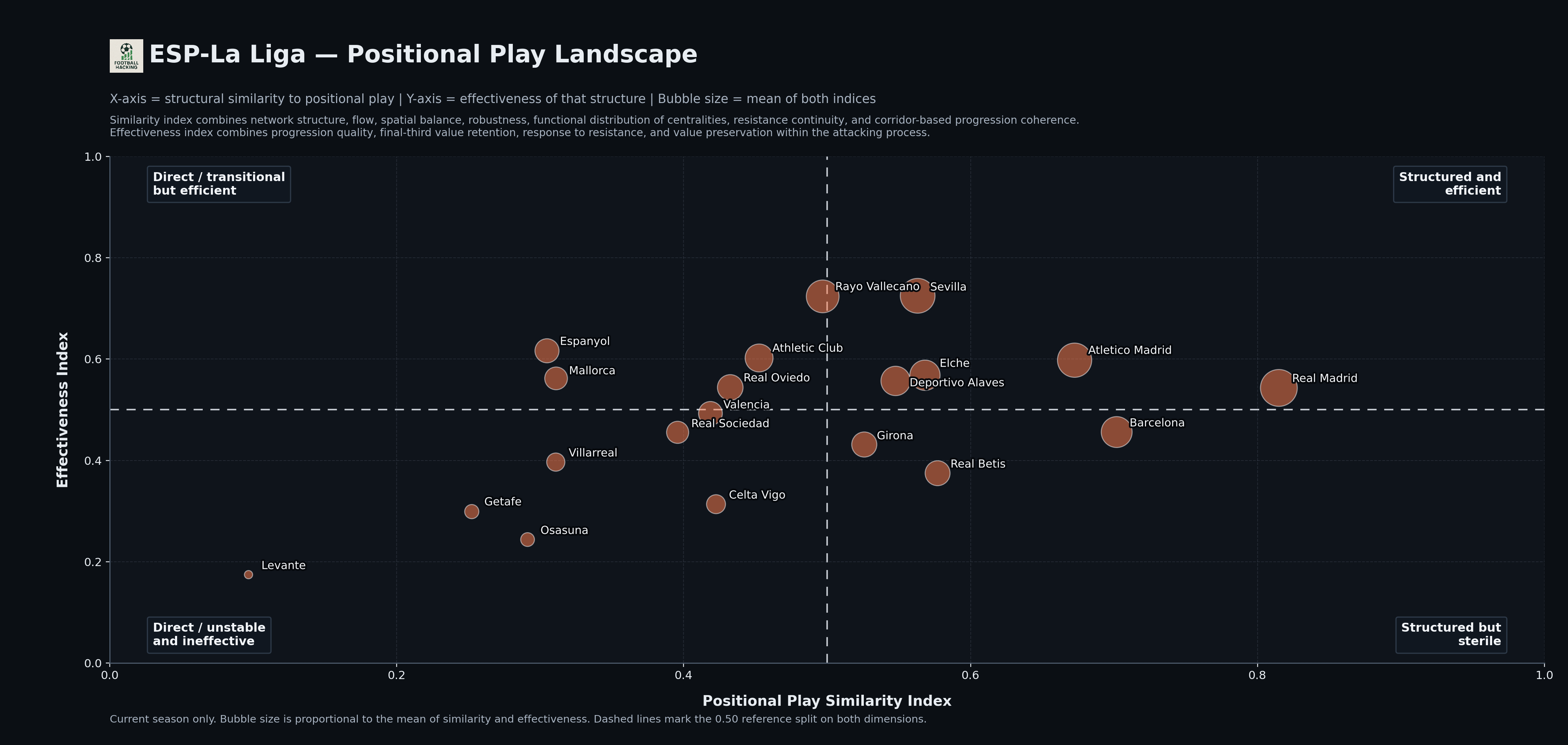 It was produced using pass network structure data, with the explicit goal of diagnosing whether teams behave like positional systems. Instead of relying on labels, we rely on structure.