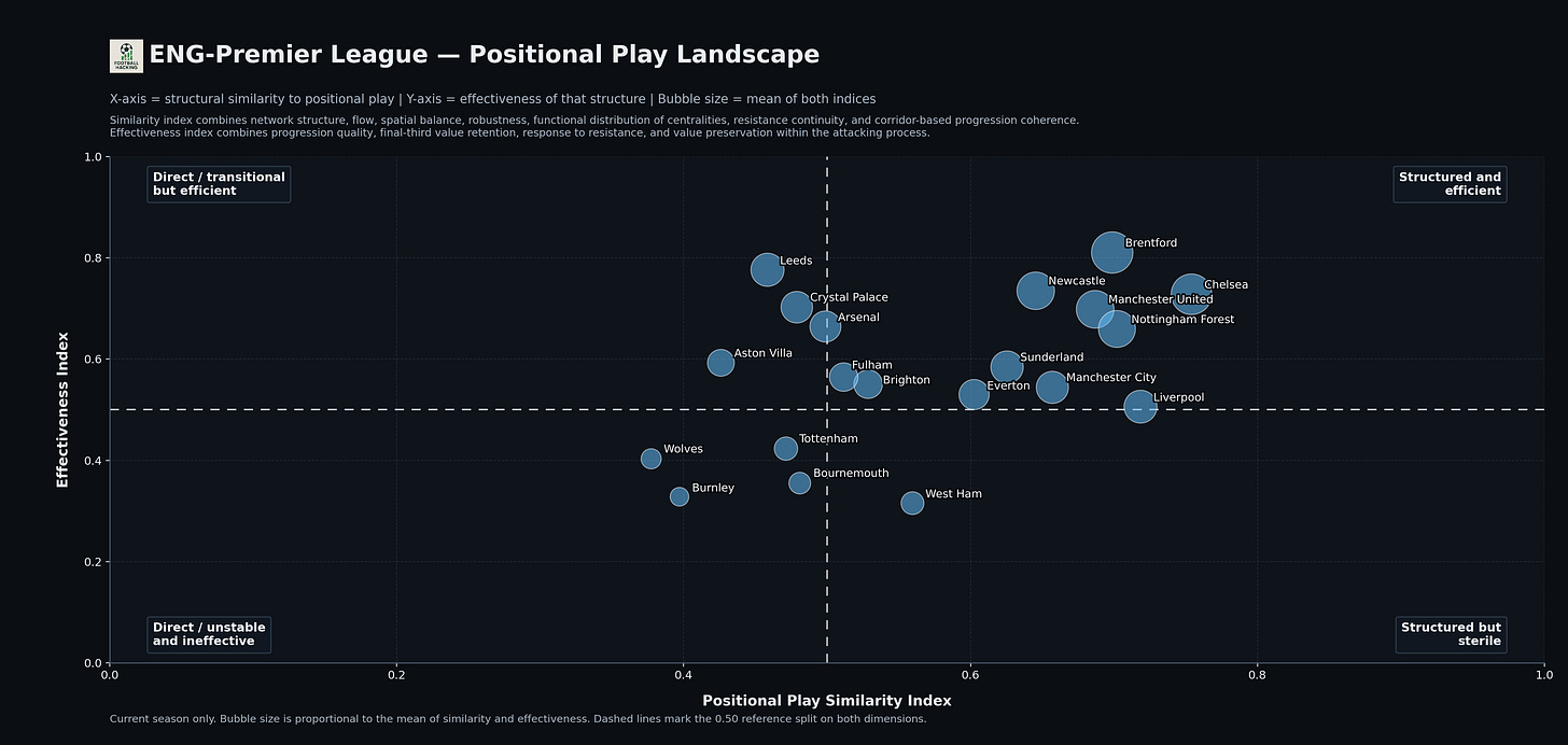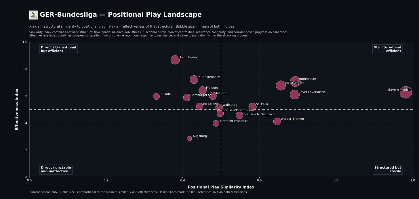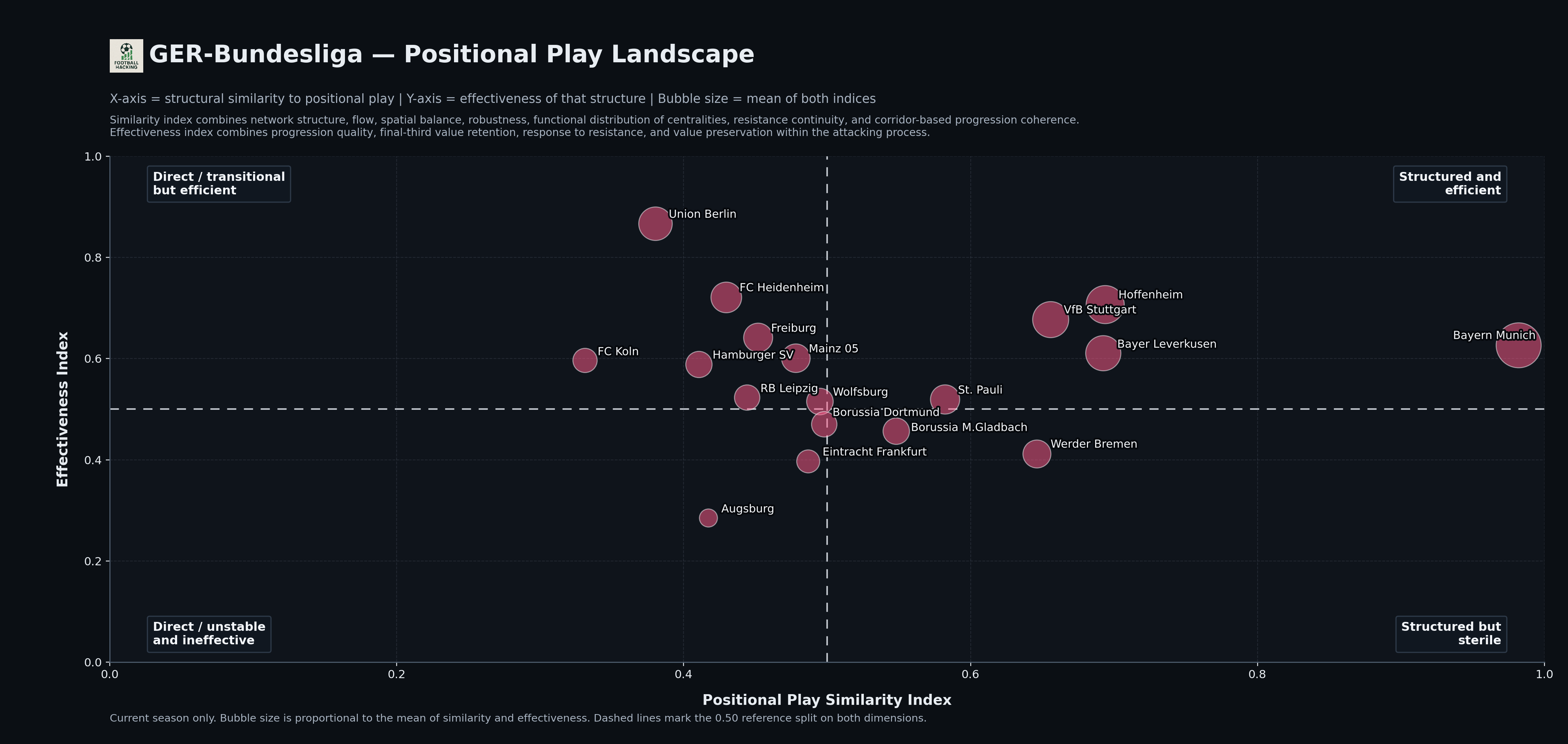 The Bundesliga shows that effectiveness can exist without positional structure, but often with less control and higher volatility.